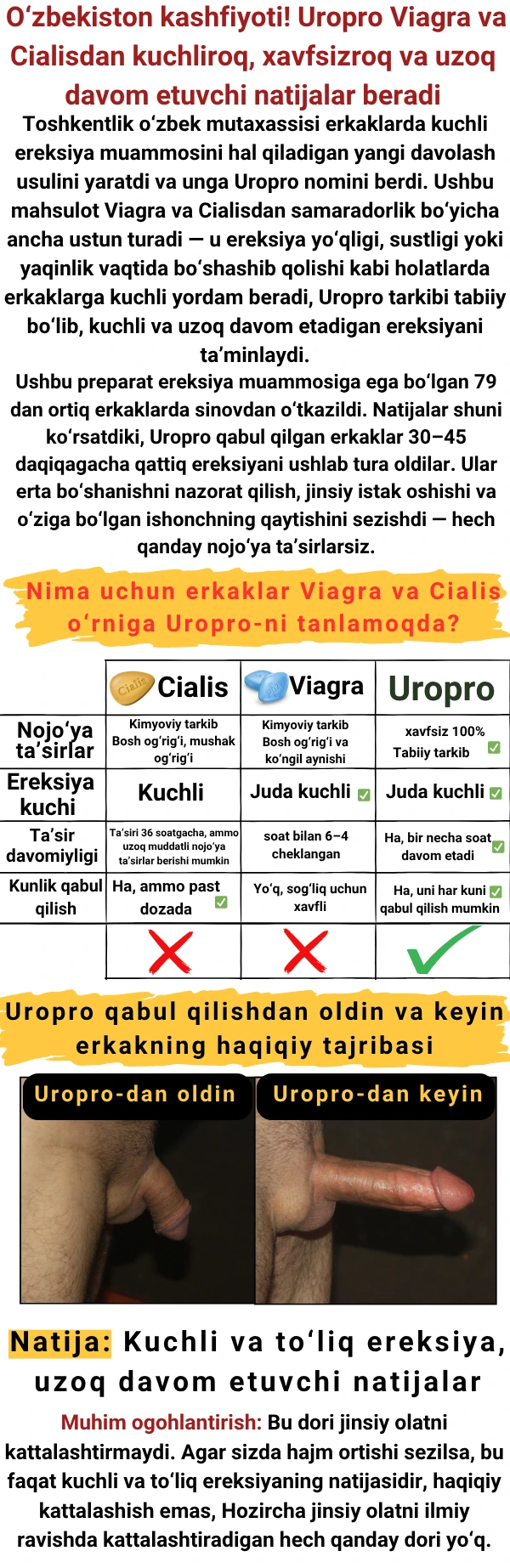 Agar siz haqiqatan ham O‘zbekistonda yashayotgan bo‘lsangiz, “Aylantirish” tugmasini bosganingizdan so‘ng davolash vositasiga 100% chegirma olasiz va buyurtma shakli darhol paydo bo‘ladi, Agar siz O‘zbekistonda yashamasangiz, afsuski, bu taklifdan hech qachon foydalana olmaysiz, chunki hozircha dori faqat O‘zbekistonda mavjud.